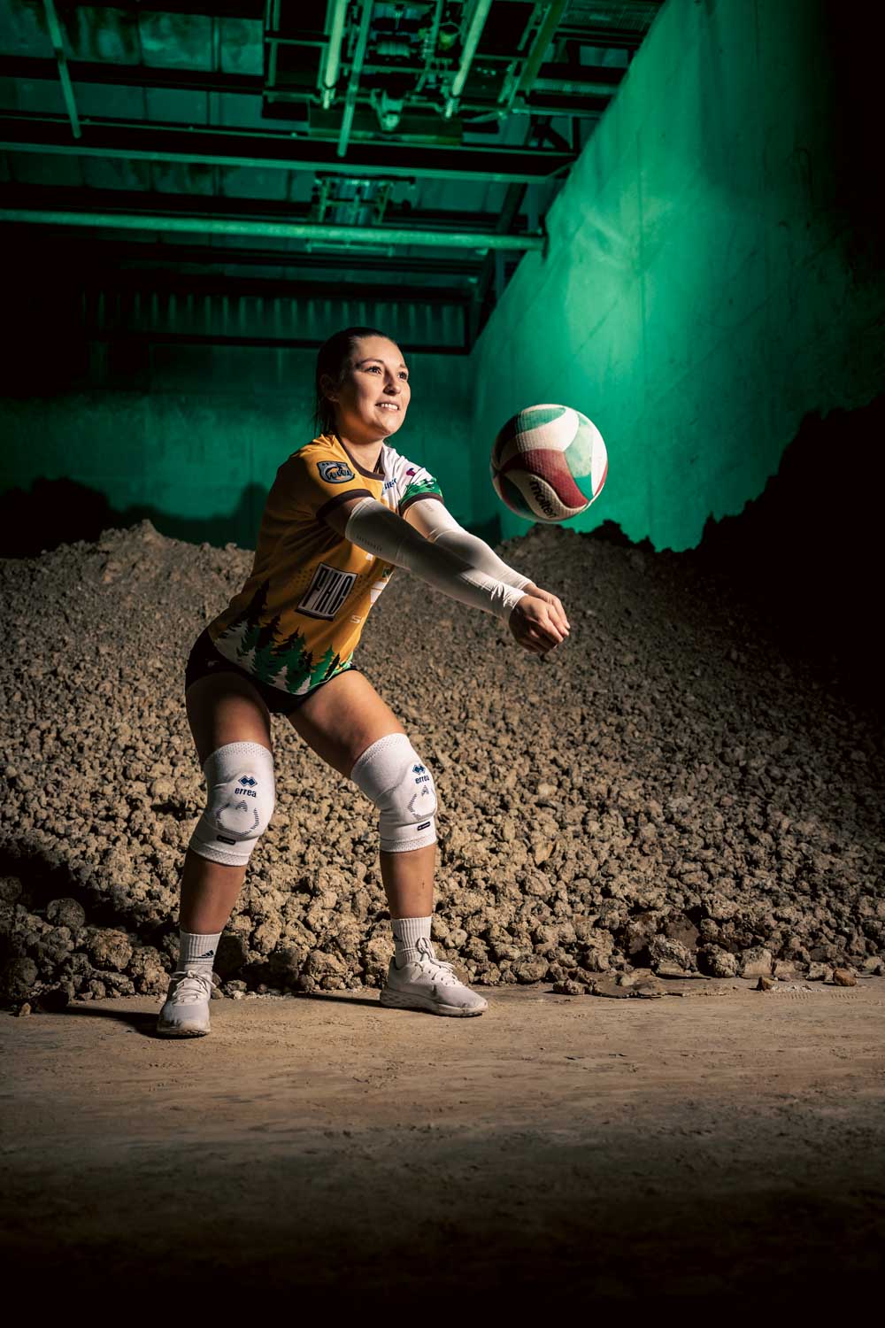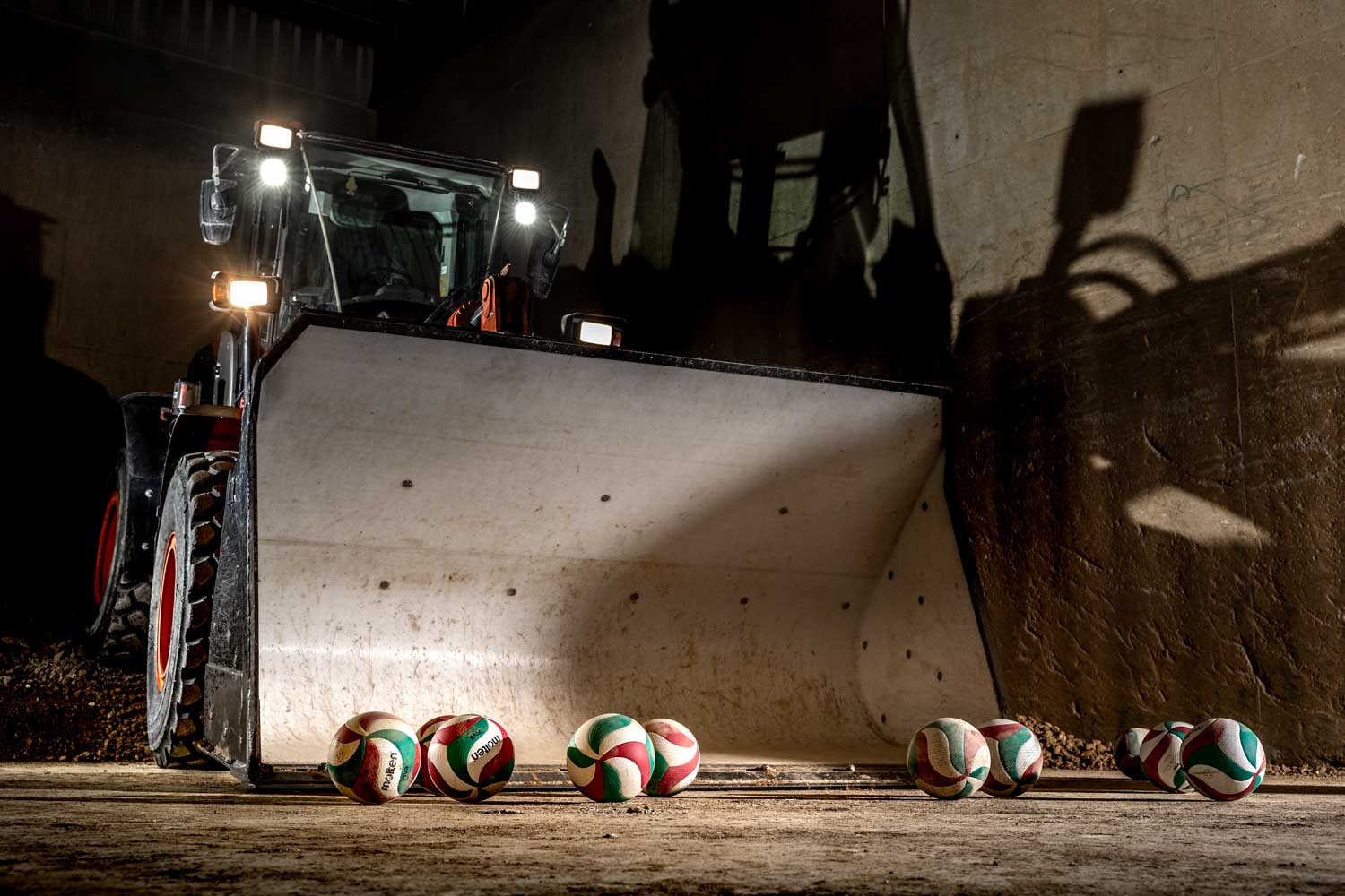 Die Herren-Mannschaft Westerwald-Volleys um und an einem großen Radlader platziert innerhalb der Tonfabrik Blumentopf Spang werfen gerade Bälle in die Luft.